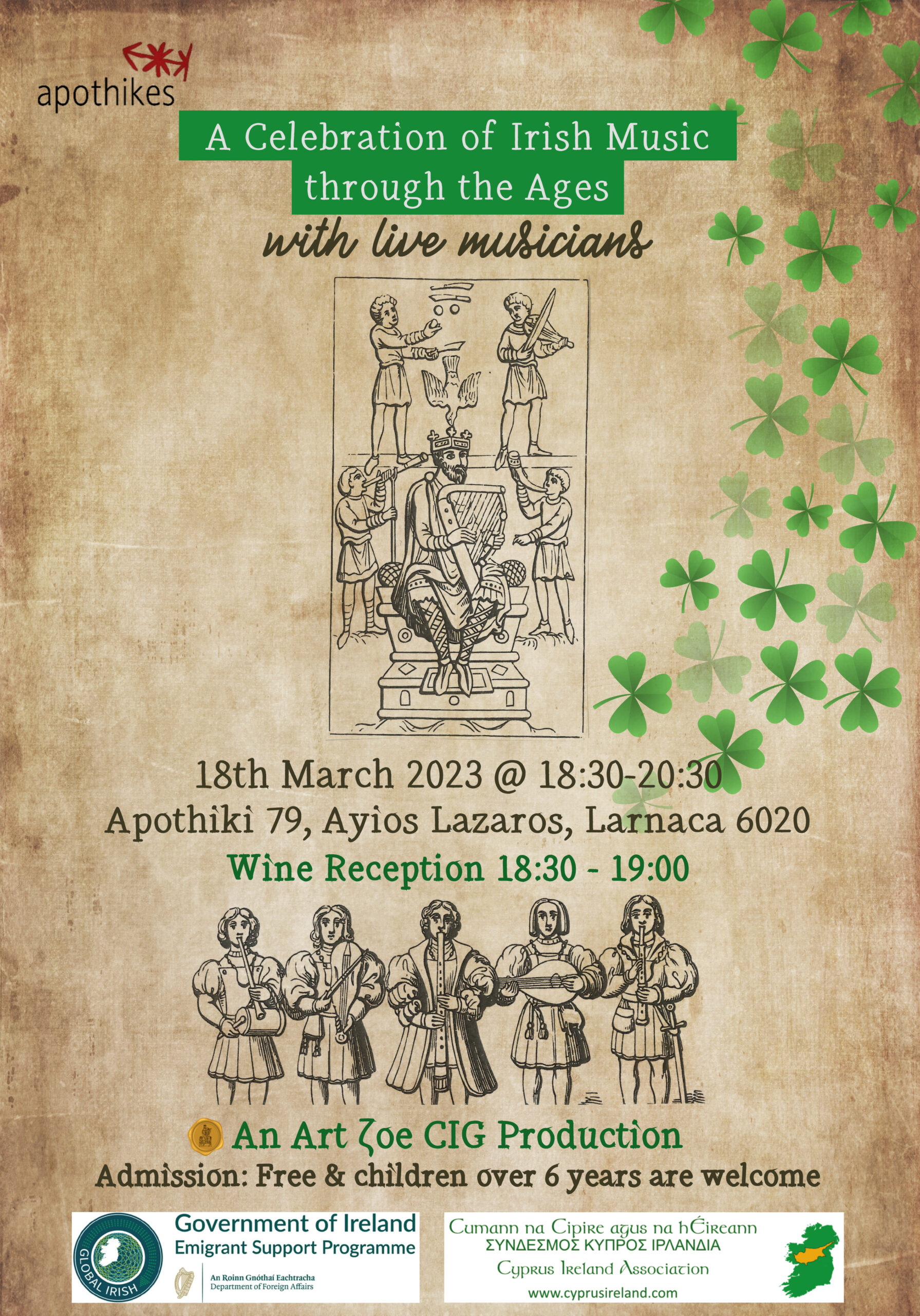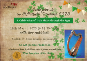 Wine & Cheese Reception for this event starts at 18:30-19:00 and admission to the evening is free. Children over 6 years of age are welcome. So, let’s celebrate an evening of Irish culture together this coming St. Patrick’s Weekend at Apothiki 79, Ayios Lazaros, Larnaca 6020.