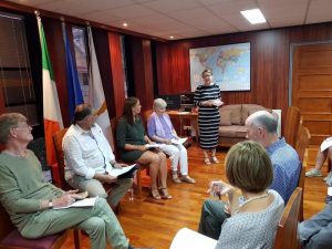 A number of literary stalwarts gathered at the Irish Embassy on 24th May for an evening celebrating Ireland’s rich literary heritage featuring readings from the work of John McGahern, Edna O’Brien, Anna Burns and Colm Tóibín amongst others. Special thanks to Colette Ní Réamoinn Ioannidou who organised the event and to readers Brian Kelly, Andreas Iacovides and Tracey Brennan for their eloquent performances and also the the Ambassador who supplied the room and the wine and nibbles afterwards.